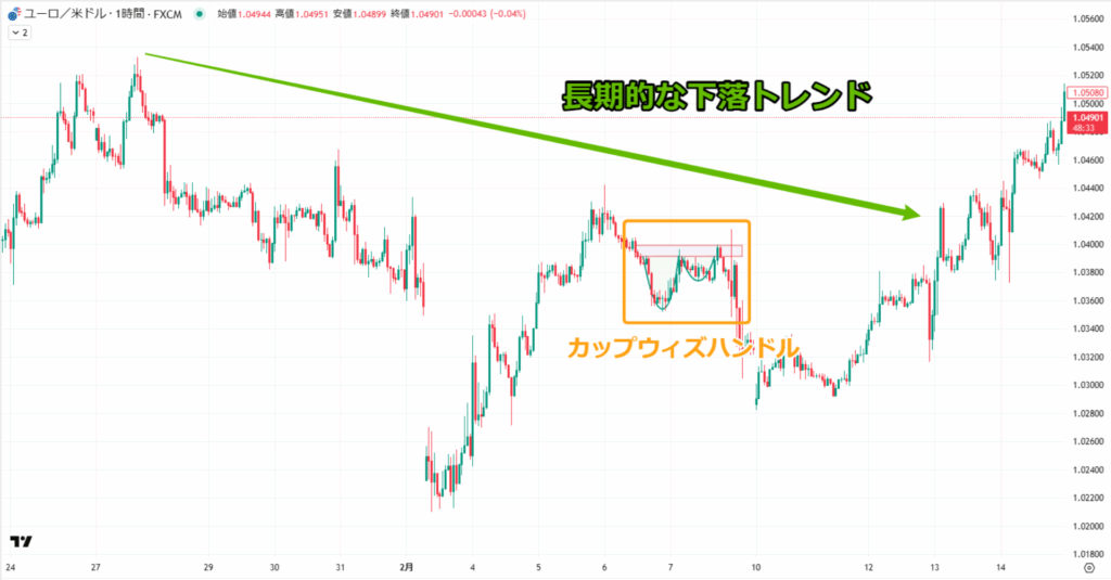 実際に先ほど失敗例として紹介したユーロドルでは、長期的に下落トレンドが続いている中でカップウィズハンドルが形成されました。
