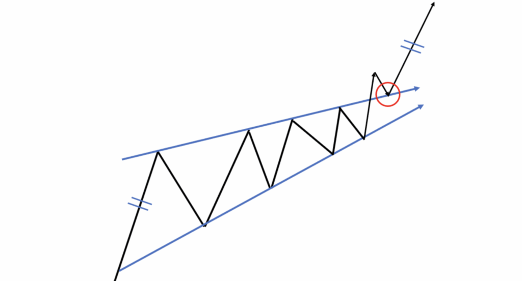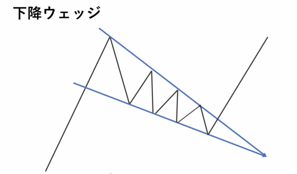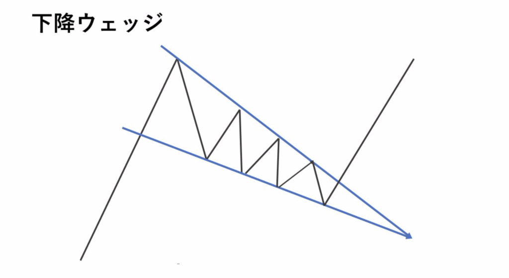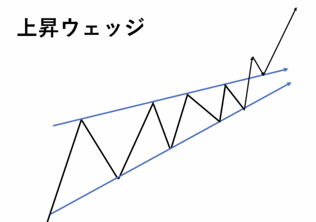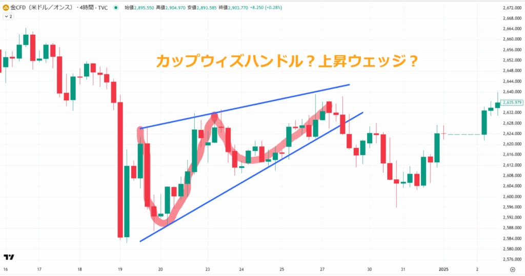 例えば、以下の画像のような右肩上がりのカップウィズハンドルは、見方によっては下落シグナルとなる「上昇ウェッジ」と捉えることもできるのです。