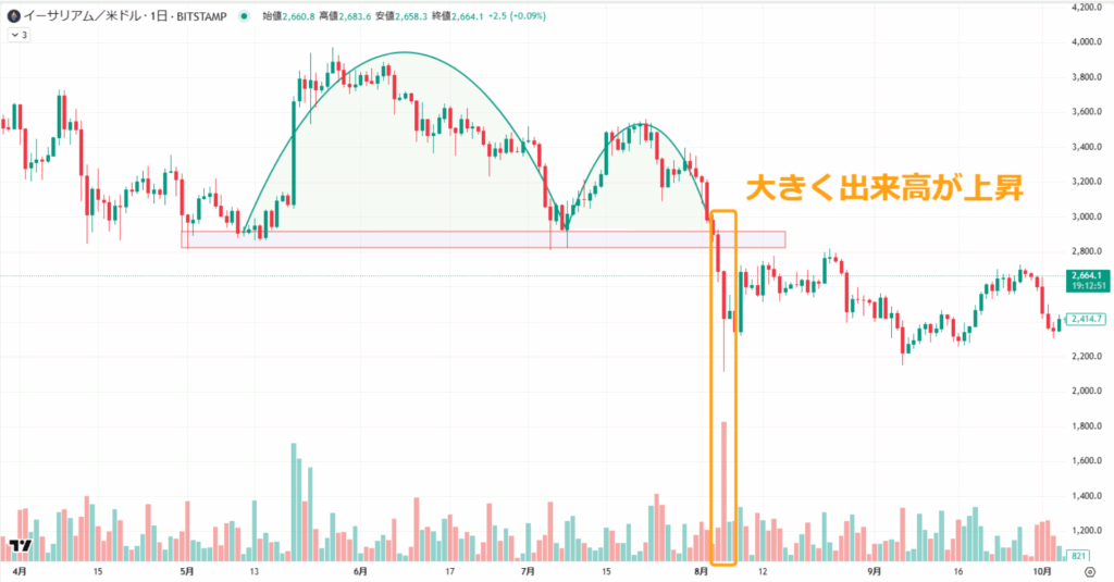 例えば以下のチャートでは、ネックラインを突破した際に大きく出来高が上昇していることが分かります。
