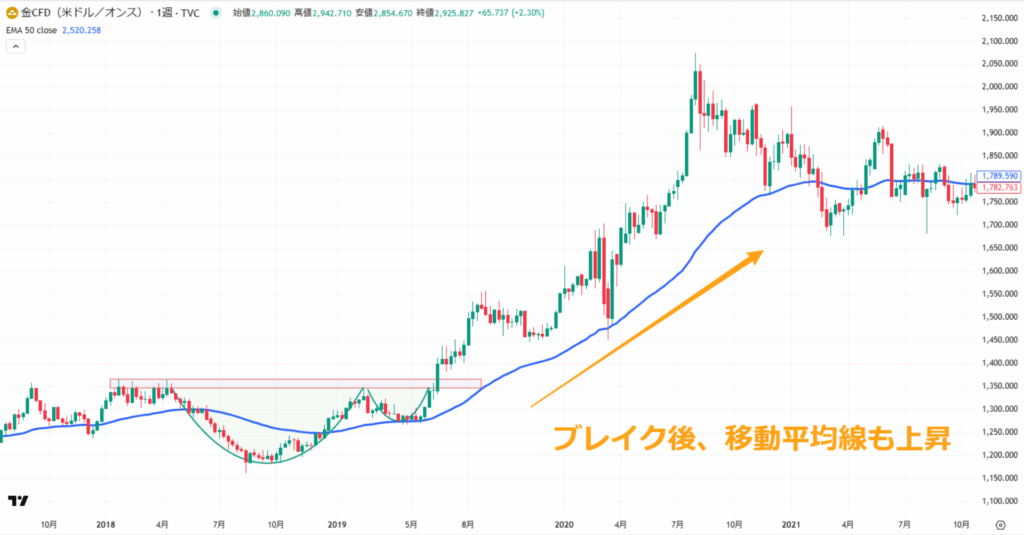 例えば、以下のチャートではカップウィズハンドルがブレイク後、価格が移動平均線を超えて推移し続けているので本格的な上昇トレンドだと判断することができます。