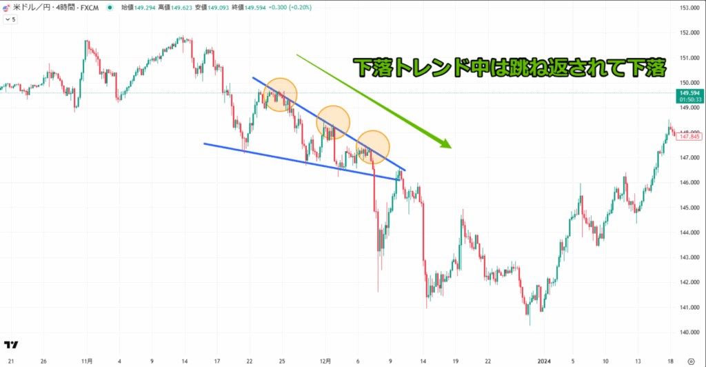 例えば週足レベルで下降トレンドが続いている中、1時間足でカップウィズハンドルが形成された場合、短期的には上昇の動きが見られても、すぐに戻り売りに押されてしまいます。