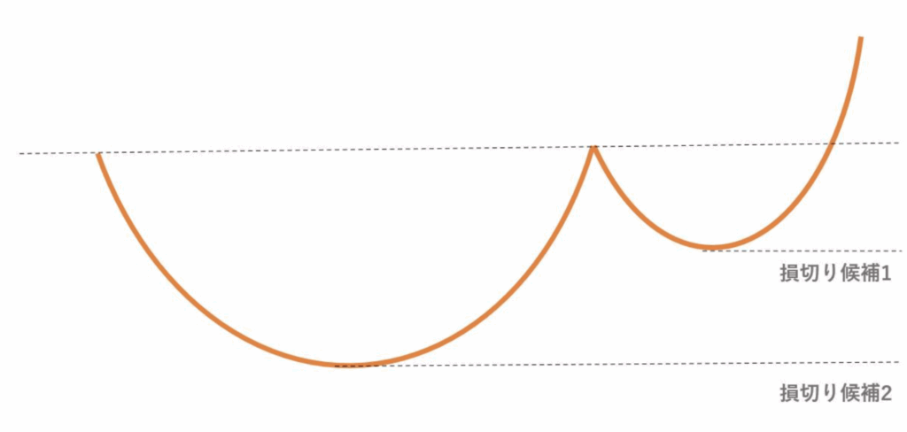 ハンドルを基準にする場合、損切りまでの値幅が少なくなるのでリスクリワードを高められるものの、ダブルボトムのような形になると損切りとなってしまいます。