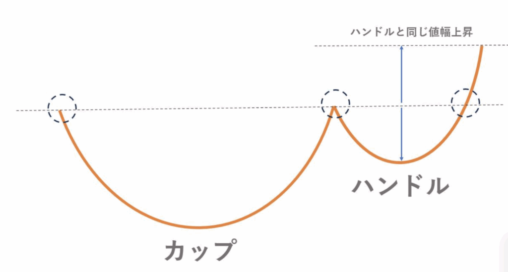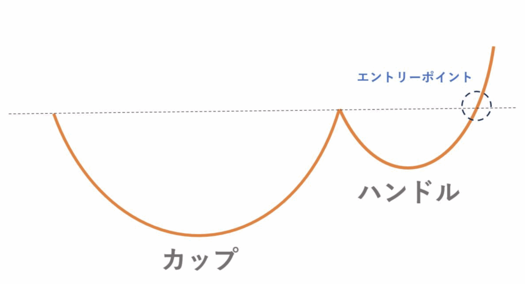 カップウィズハンドルとは、長期的な下落トレンドからの回復を示すチャートパターンです。