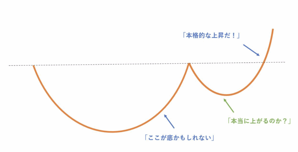 価格がチャートパターンのセオリー通りに推移するためには、チャートパターンの形成過程でトレーダーの心理がうまく噛み合う必要があります。