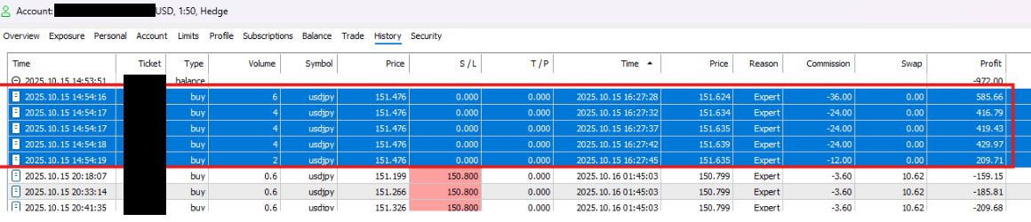 - 利益の集中: 口座の利益の大半は、2025年10月15日、1分以内に行われた、すべて同じエントリー価格151.476のUSDJPYの5回連続の買い取引からなる、単一の取引クラスターによって生み出されました。各取引は互いに数秒以内にほぼ同一の価格(151.624 – 151.639)で決済され、合計で約2,060円の利益を生み出しました。このクラスターだけで口座の総利益の85%以上を占めており、その後のより小さな取引は最小限の利益か小さな損失をもたらしたに過ぎません。