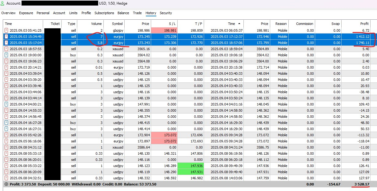 - 利益の集中: 連続した2つのEURJPYの売り取引が、合計で$3,152.23($1,412.12 + $1,740.11)の利益を生み出しました。
